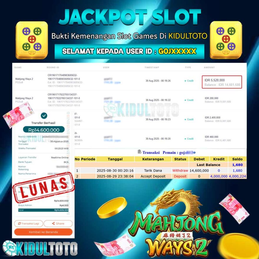 Kabar gembira datang dari KIDULTOTO! Salah satu member setia kami, dengan User ID GOJ**** berhasil mencetak kemenangan besar senilai 14.600.000 . Kemenangan fantastis ini menjadi bukti nyata bahwa keberuntungan bisa datang kapan saja bagi siapa saja yang bermain dengan semangat dan strategi.