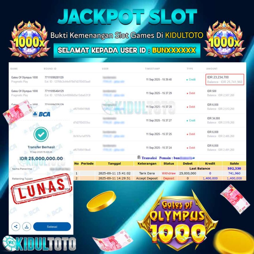 Kabar gembira datang dari KIDULTOTO! Salah satu member setia kami, dengan User ID BUN****** berhasil mencetak kemenangan besar senilai 25.000.000 . Kemenangan fantastis ini menjadi bukti nyata bahwa keberuntungan bisa datang kapan saja bagi siapa saja yang bermain dengan semangat dan strategi.